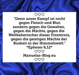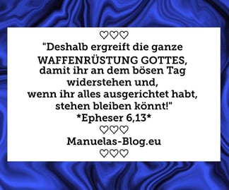 "Schließlich: Werdet stark im Herrn und in der Macht seiner Stärke! Zieht die ganze Waffenrüstung GOTTES an, damit ihr gegen die Listen des Teufels bestehen könnt! Denn unser Kampf ist nicht gegen Fleisch und Blut, sondern gegen die Gewalten, gegen die Mächte, gegen die Weltbeherrscher dieser Finsternis, gegen die geistigen Mächte der Bosheit in der Himmelswelt. Deshalb ergreift die ganze Waffenrüstung GOTTES, damit ihr an dem bösen Tag widerstehen und, wenn ihr alles ausgerichtet habt, stehen bleiben könnt! So steht nun, eure Lenden umgürtet mit Wahrheit, bekleidet mit dem Brustpanzer der Gerechtigkeit und beschuht an den Füßen mit der Bereitschaft zur Verkündigung des Evangeliums des Friedens! Bei alledem ergreift den Schild des Glaubens, mit dem ihr alle feurigen Pfeile des Bösen auslöschen könnt! Nehmt auch den Helm des Heils und das Schwert des Geistes, das ist GOTTES Wort! Mit allem Gebet und Flehen betet zu jeder Zeit im Geist, und wacht hierzu in allem Anhalten und Flehen für alle Heiligen und auch für mich, damit mir Rede verliehen wird, wenn ich den Mund öffne, mit Freimütigkeit das Geheimnis des Evangeliums bekannt zu machen – für das ich ein Gesandter in Ketten bin –, damit ich in ihm freimütig rede, wie ich reden soll." Epheser 6,10-20