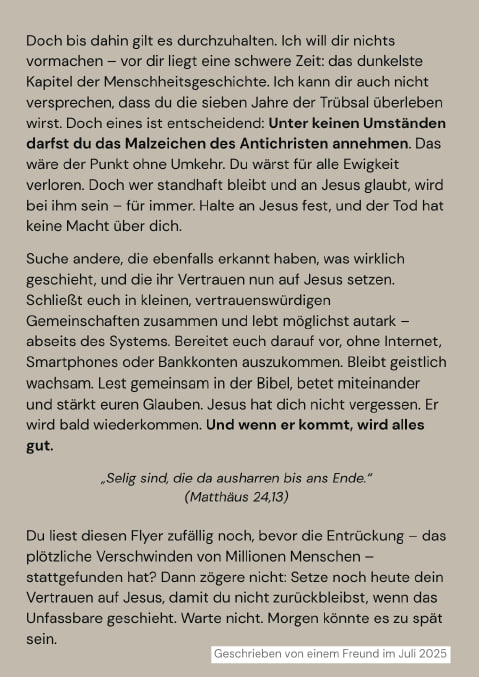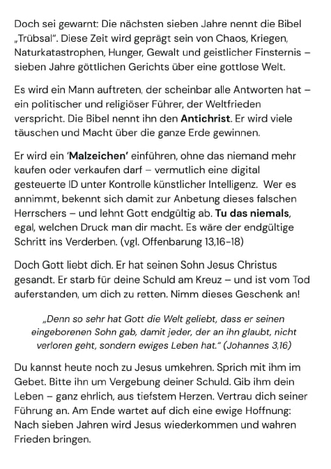 Bis dahin: Halte an deinem Glauben fest, wende dich an JESUS, und lass dich nicht vom Antichristen und seinem System verführen.
