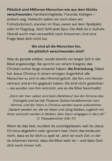 Doch prüfe bitte selbst: Was haben wir, die wir verschwunden sind, gemeinsam? Wir sind alle wiedergeborene Christen (Johannes 3,3), und wir alle haben JESUS geliebt und sind Ihm nachgefolgt. Wir sind jetzt bei JESUS im Himmel. ER hat uns zu sich geholt, wie Er es versprochen hat (Johannes 14,1-3). Bitte mache dir also um mich keine Sorgen.